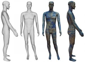 Окончателно реконструираният модел е показан по-долу. Докато геометричните детайли е трудно да се прецени от тях, трябва да се отбележи, че пропуските в шевовете на талията и ръцете са решени и те са в мащаб от 1 мм. Както се очакваше, най-предизвикателните области бяха под мишниците и между краката. За това допринасят три фактора: тези региони имат най-малко припокриващи се изображения, обикновено са по-тъмни и снимките обикновено се правят под ъгъл на срязване.